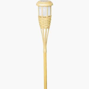 Flickering amber LED, weaved 100% real bamboo construction, and shaded plastic lens make this look like the real thing. 6'' torch head diameter, 4 piece pole assembly, approximately 60'' total height. Includes 2 NiCad rechargeable batteries. No wiring, easy to install.