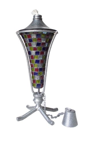 Forget trying to push those tiki torches through the turf - just set this festive 12 Inch table torch in the center of the action! The mosaic design is worked in a pewter powder coated finish, the torch includes a never-replace fiberglass wick and the snuffer's already attached so you can't lose it. 12 Inch High Snuffer included Mosaic with pewter powder coated finish