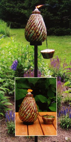 Add a touch of elegance to your patio entertaining. Each one of these hand-glazed ceramic torches is a unique work of art. This torch has a beautiful Jade and Sable artisan reactive glaze, mottled for a distinctive flair.The decanter-style lid is attached with a chain, and can be used as a snuffer.The 3-piece powder-coated metal stake allows for an adjustable height of 48" to 66", or you can simply set it on a table-top without the stake.Uses Citronella Lamp Oil or any other standard Lamp Oil.