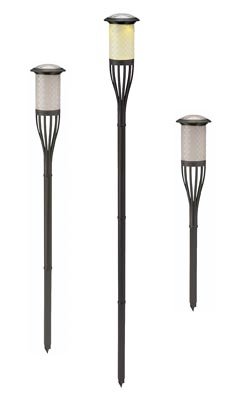 - Attractive, tropical torch design (set of 2) with black finish and frosted bamboo pattern lens.